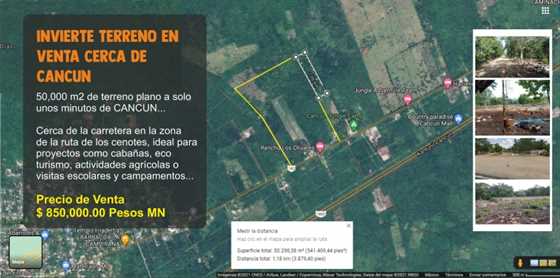 50,000 m2 de terreno plano a solo unos minutos deCANCUN... Excelente plusvalía y situado cerca de la carretera con dos entradasen el poblado de Leona Vicario.