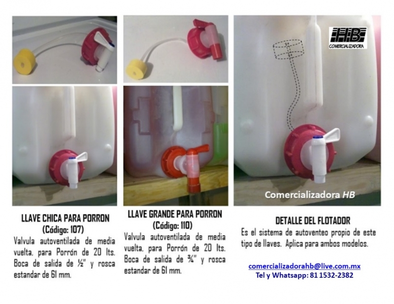 Llave para Porrón o Bidón de 20 litros autoventilada, diseñada especialmente para un fácil manejo y trasvase de productos químicos, productos de limpieza y líquidos en general, ya que brinda un libre caudal gracias al sistema de "Autoventeo" que es gobernado por un flotador, propio del diseño de estas llaves. Su robusta construcción a base de Polietileno Lineal de Baja Densidad en su cuerpo principal y con su espiga de Polipropileno, le permite soportar una amplia gama de compatibilidad química. Le ofrecemos dos modelos de llaves, la chica que tiene un diámetro en su boca de salida de ½” (código 107)y la grande que tiene un diámetro de salida de ¾” (código 110), ambas cuentan con rosca interna de 61mm, que es la medida estándar de la mayoría de los contenedores tipo porrón, de 20, 30 y 50 litros que se utilizan en nuestro país. La llave chica tiene un precio de $125.00 pesos + IVA y la grande tiene un precio de$139.00 pesos + IVA. Evite derrames de líquidos, simplifique su trabajo, evite molestias y optimize sus operaciones con la extensa gama de llaves, bombas y válvulas que podemos ofrecerle. Pida mayores informes en el teléfono 81 1532-2382 o directamente en nuestro correo electrónico: comercializadorahb@live.com.mx donde le atenderemos con el gusto de siempre. Comercializadora HB, en Monterrey Nuevo León, México. En Comercializadora HB vendemos soluciones!