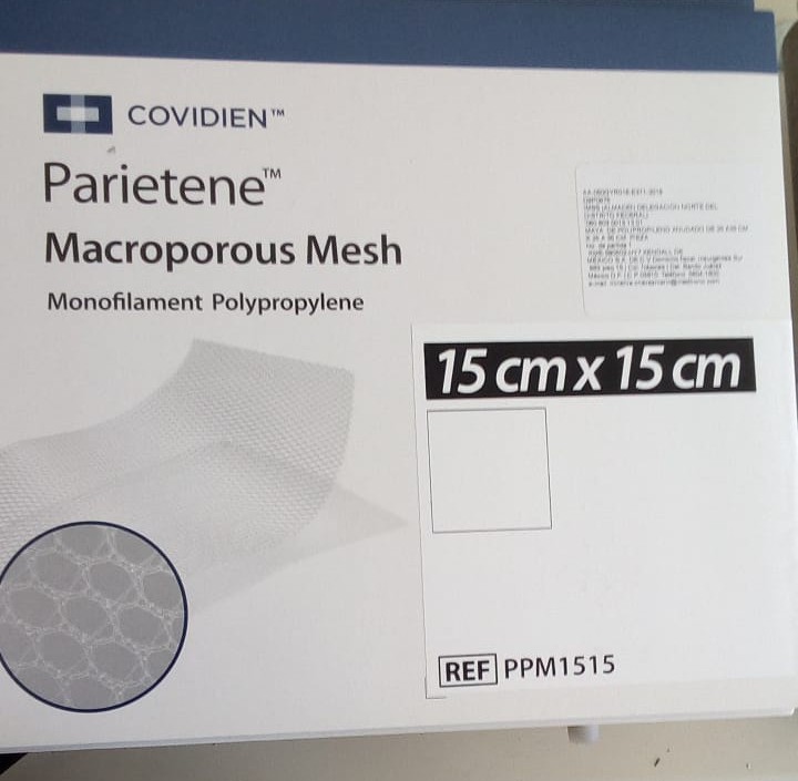 Malla plana estándar de polipropileno para reparación de hernia inguinal medidas 15 x 15 cm. Covidien Referencia PPM1515