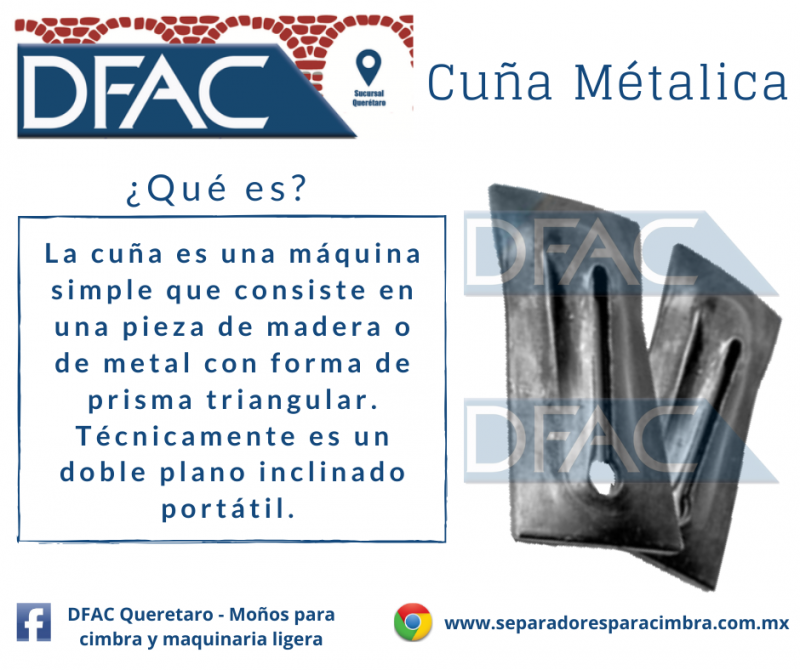 DFAC QUERÉTARO Empresa dedicada a la Distribución y Fabricación de Accesorios para Cimbra ofrece CUÑAS PARA CIMBRA y los podemos entregar en tu obra en Santiago Querétaro sin costo extra con compras mínimas de $1,800.00 o embarcar a todo el país (costo del flete corre por cuenta del cliente). Llama y cotiza con nosotros para informarte de la extensa gama de productos que conforman nuestro portafolio tels.: 4422517168 - 4422517169 cel.: 5546134738 Facebook : DFAC QUERÉTARO - MOÑOS PARA CIMBRA Y MAQUINARIA LIGERA NUESTRO SITIO WEB : DFAC QUERETARO http://www.separadoresparacimbra.com.mx DFAC QUERETARO te puede facturar todas tus compras.