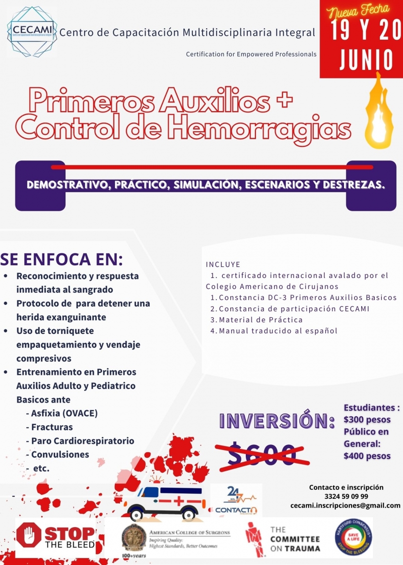 ▫️Programa Stop The Bleed® del Colegio Americano de Cirujanos (ACS, por sus siglas en inglés). + Curso de Primeros Auxilios